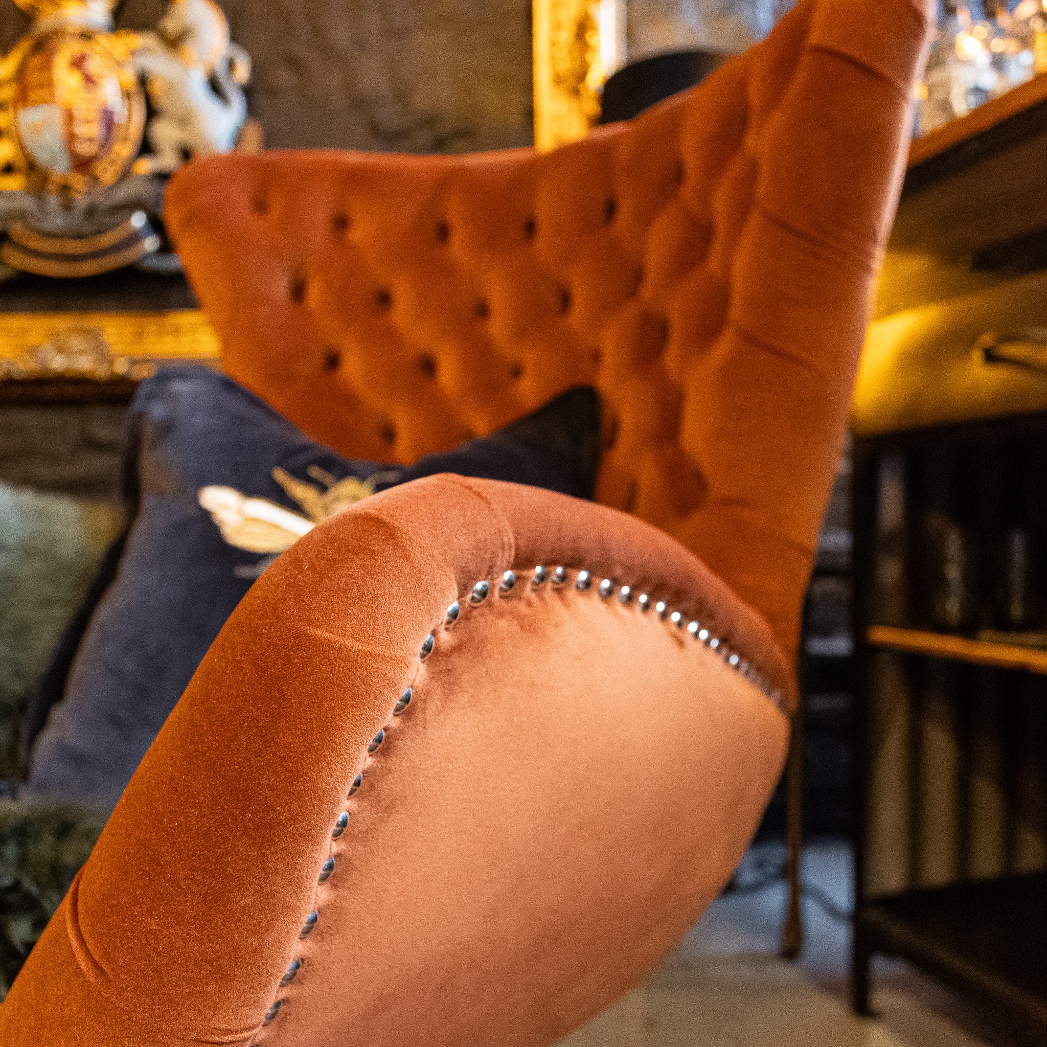 This luxurious buttoned velvet chair makes a statement with it's curvaceous silhouette. We love the deep buttoned detailing and neat studs on the underside. The generous seat makes a great spot to snuggle up to read a book or use as an accent chair in an office or bedroom.