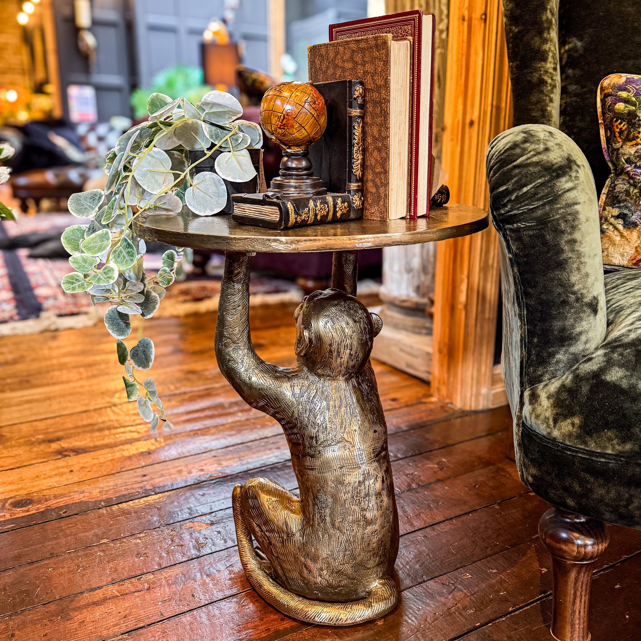 Measurements: 50cm H, Dia 44cm Add a dash of playful sophistication to your home with this Antique Brass Monkey Holding...