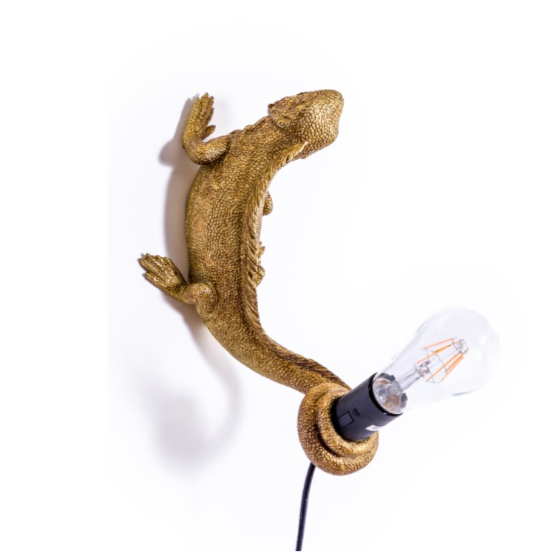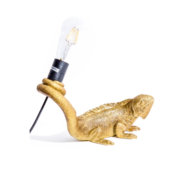 The lamp features a finely detailed iguana sculpture finished in antique gold. Its coiled tail cleverly supports a glowing Edison-style bulb, blending nature-inspired form with industrial-chic lighting.