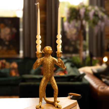 Bring a touch of playful elegance to your décor with our Antique Gold Standing Monkey Candelabra—where cheeky charm meets old-world glamour. Standing at approximately 39 cm tall, this charismatic monkey holds two candle holders aloft, ready to fill your space with a warm, flickering glow.