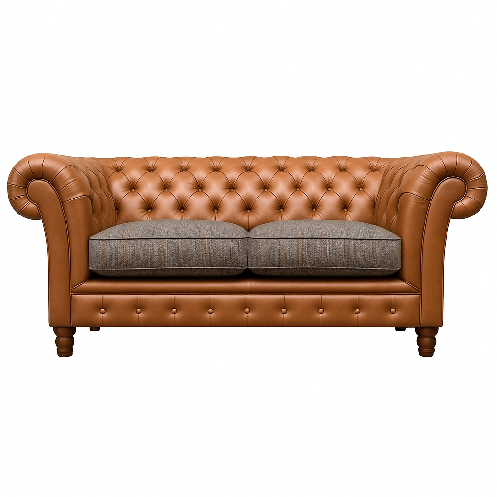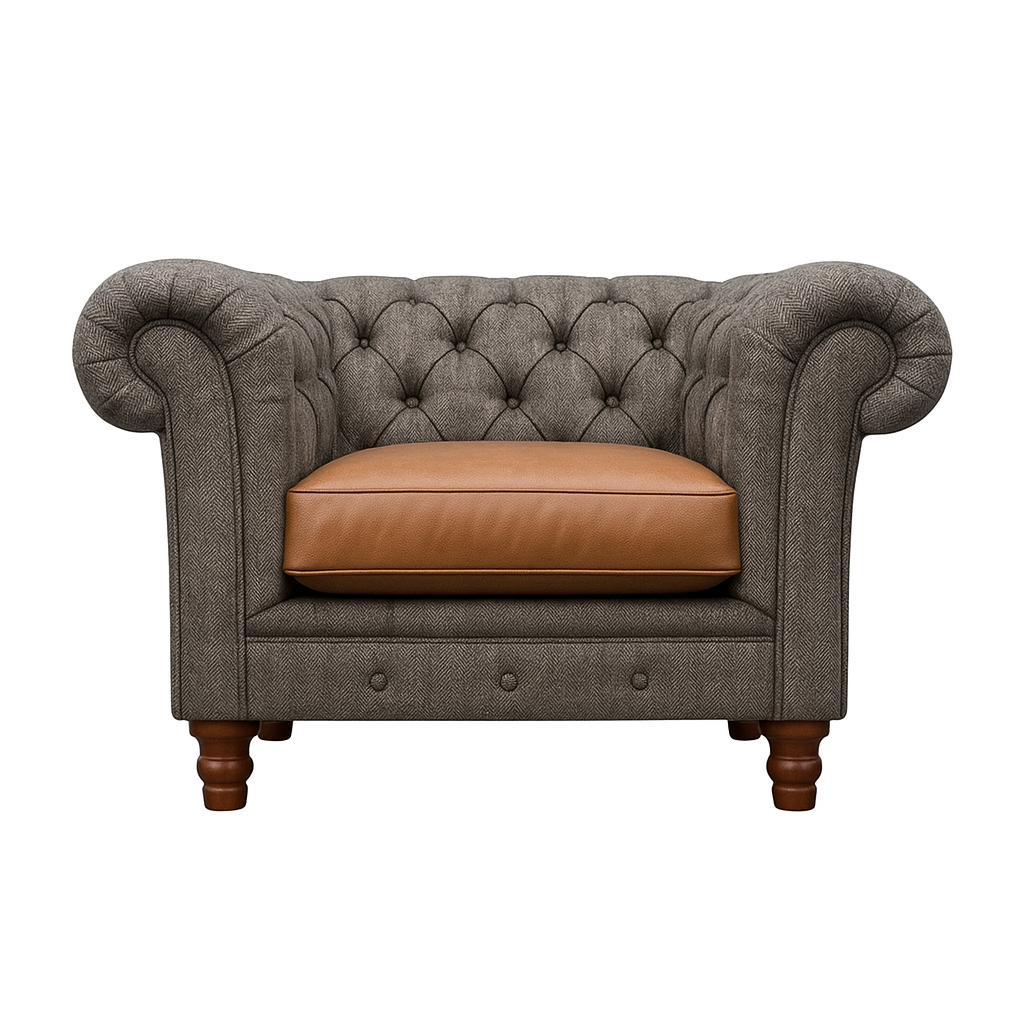 Elevate your living space with the Bertie Chesterfield – a distinguished fusion of timeless British craftsmanship and contemporary elegance. This exquisite piece features the classic Chesterfield silhouette, rendered in a smart Harris Tweed grey fabric for the back and sides, paired with sumptuous cognac leather on the seating and arms. The contrast of rustic tweed and rich leather brings texture, warmth and sophistication into one striking design.