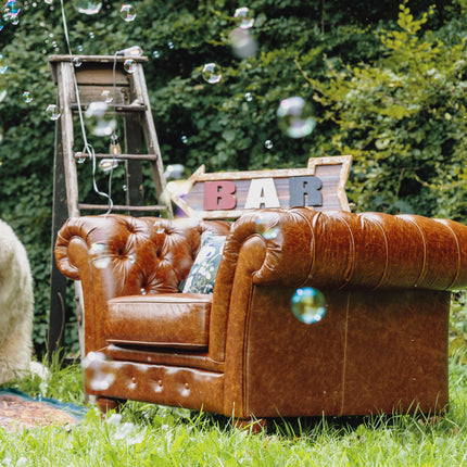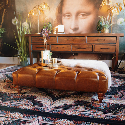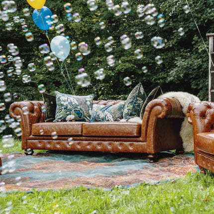 Bertie is our dark horse. Incredible value for money, with looks and form to match. This classic Chesterfield is dressed in glossy aniline tan leather. The Bertie is ideal for open plan lounge-diners, kitchens and loft apartments with the rolled back style providing a touch of glamour, without interrupting the flow of a room.