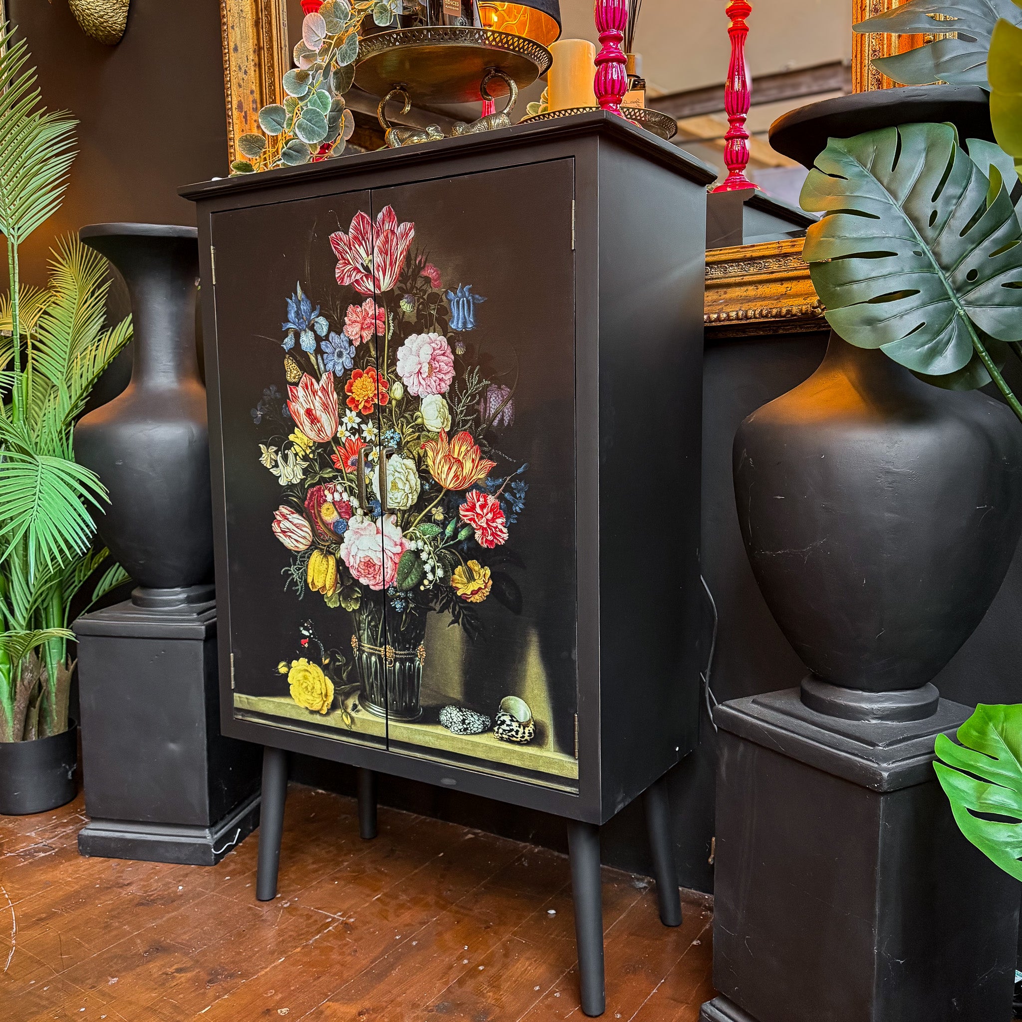 • Stunning boho floral design – A large Victoriana-style cabinet adorned with artful floral motifs brings vibrant personality to any room