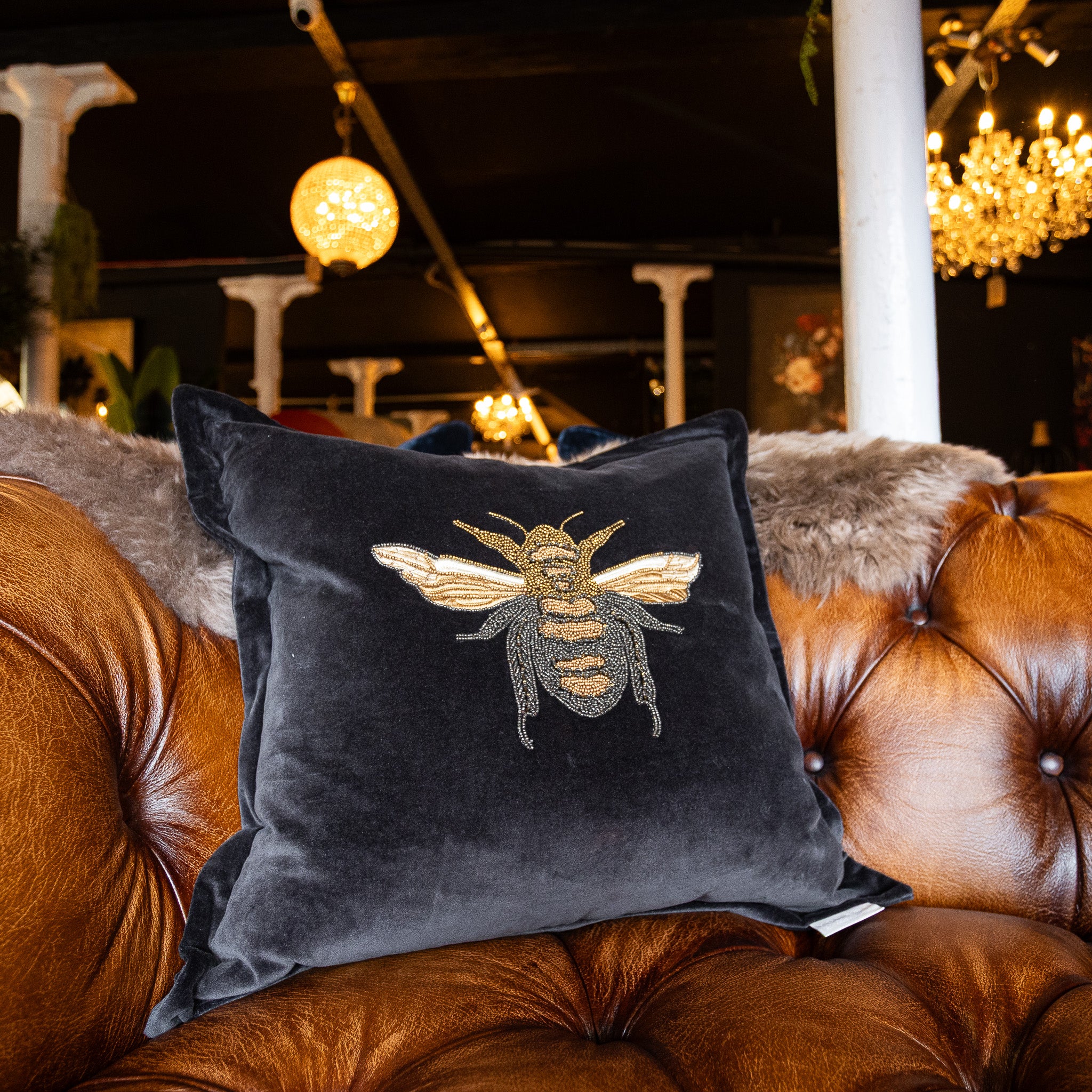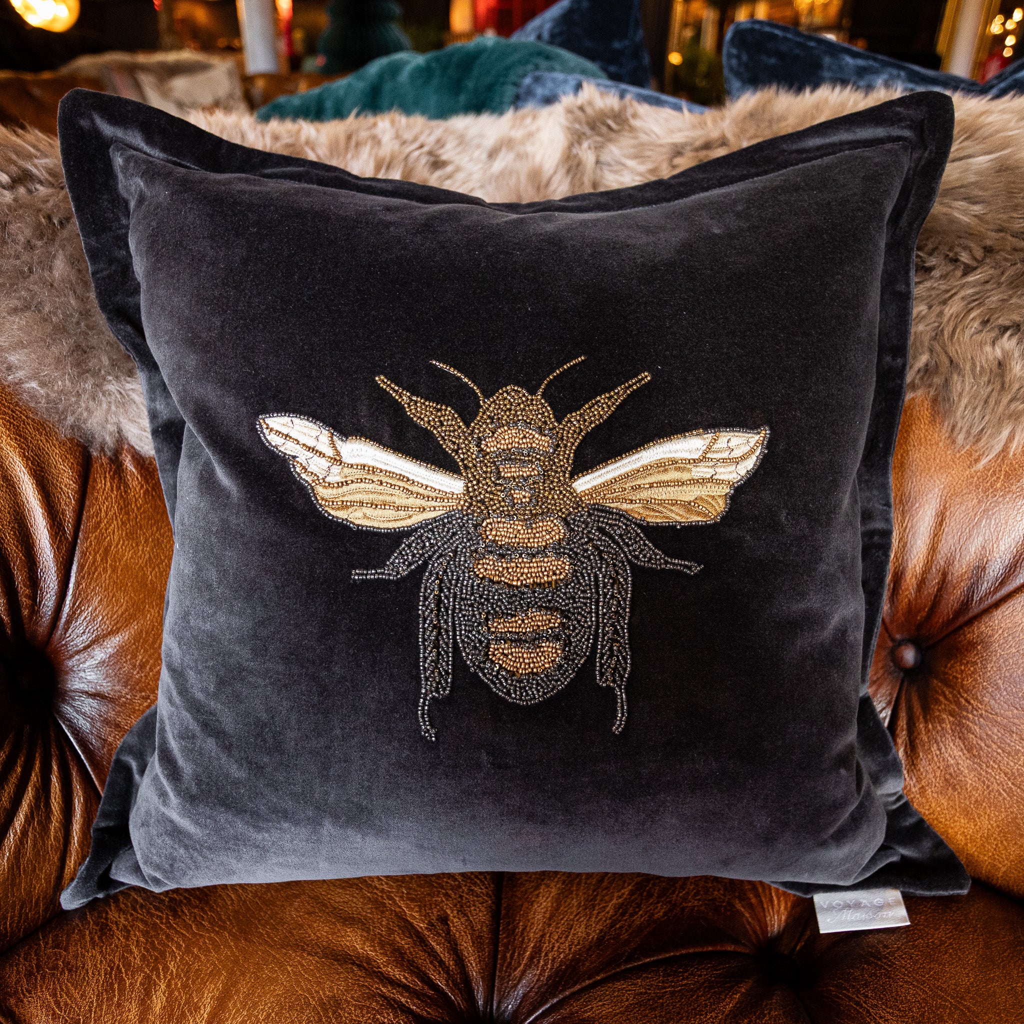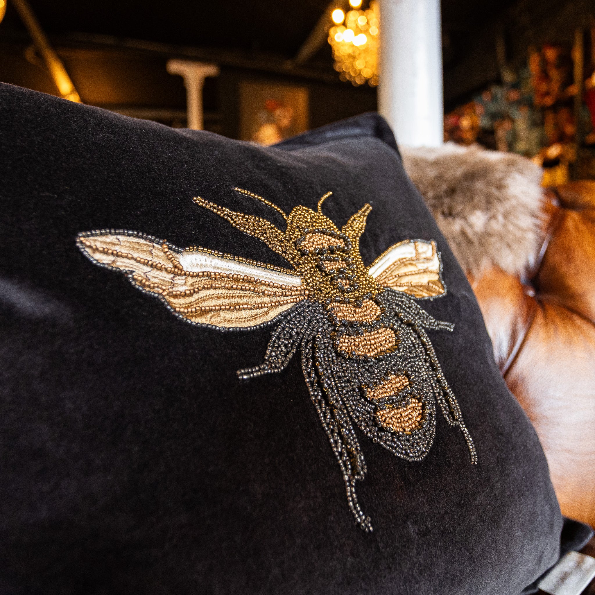 Featuring a beautifully intricate embroidered Bee design with delicate bead detailing, this stunning cushion is crafted from a luxuriously soft velvet. The beaded embellishments add a soft glimmer to the embroidery, catching the light just enough to draw the eye without overpowering your décor. It’s an artwork disguised as a cushion — rich in detail, yet effortlessly styled.