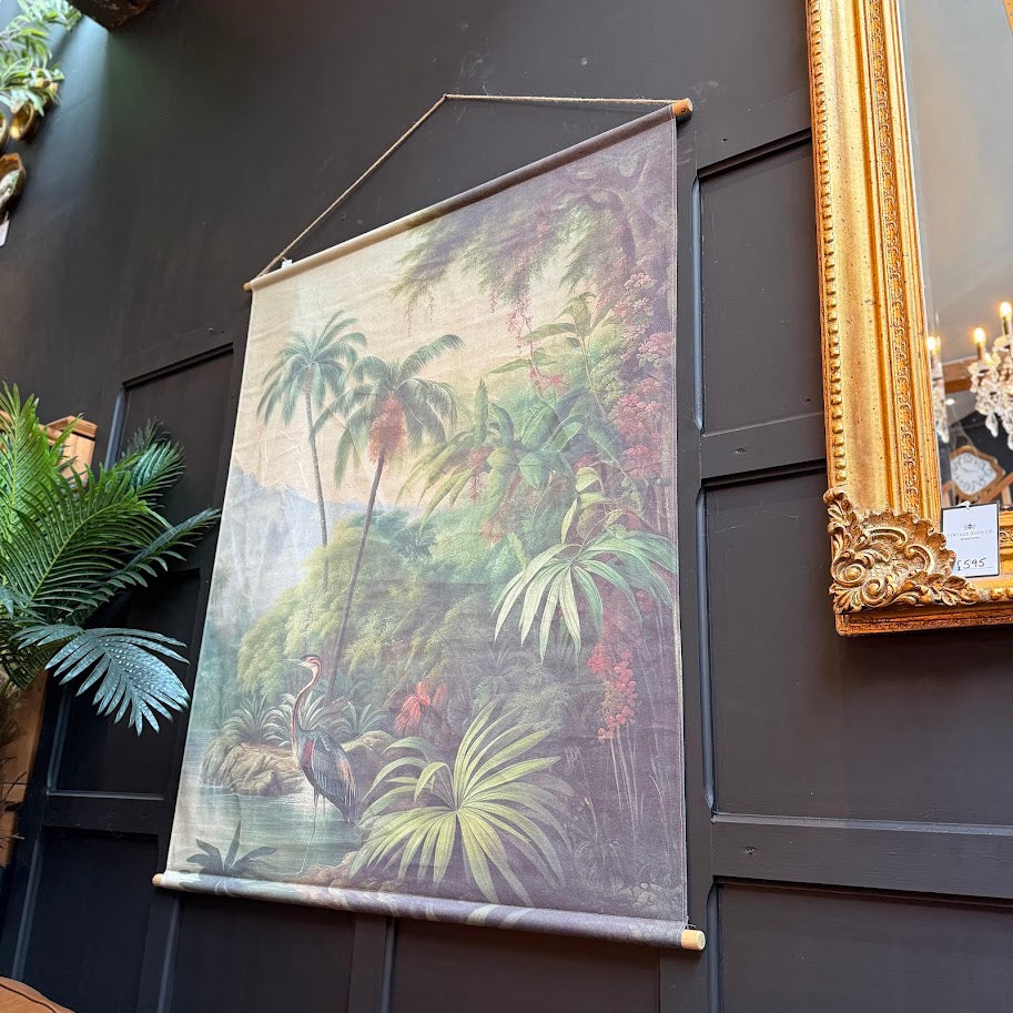 The striking rainforest scene brings depth, calm, and a touch of exotic adventure—perfect for adding vibrancy and escapism to living rooms, bedrooms, or creative spaces. Its scroll-style hanging design with tension rods and cord makes it easy to install, while the vintage-inspired finish gives it a timeless, curated look.