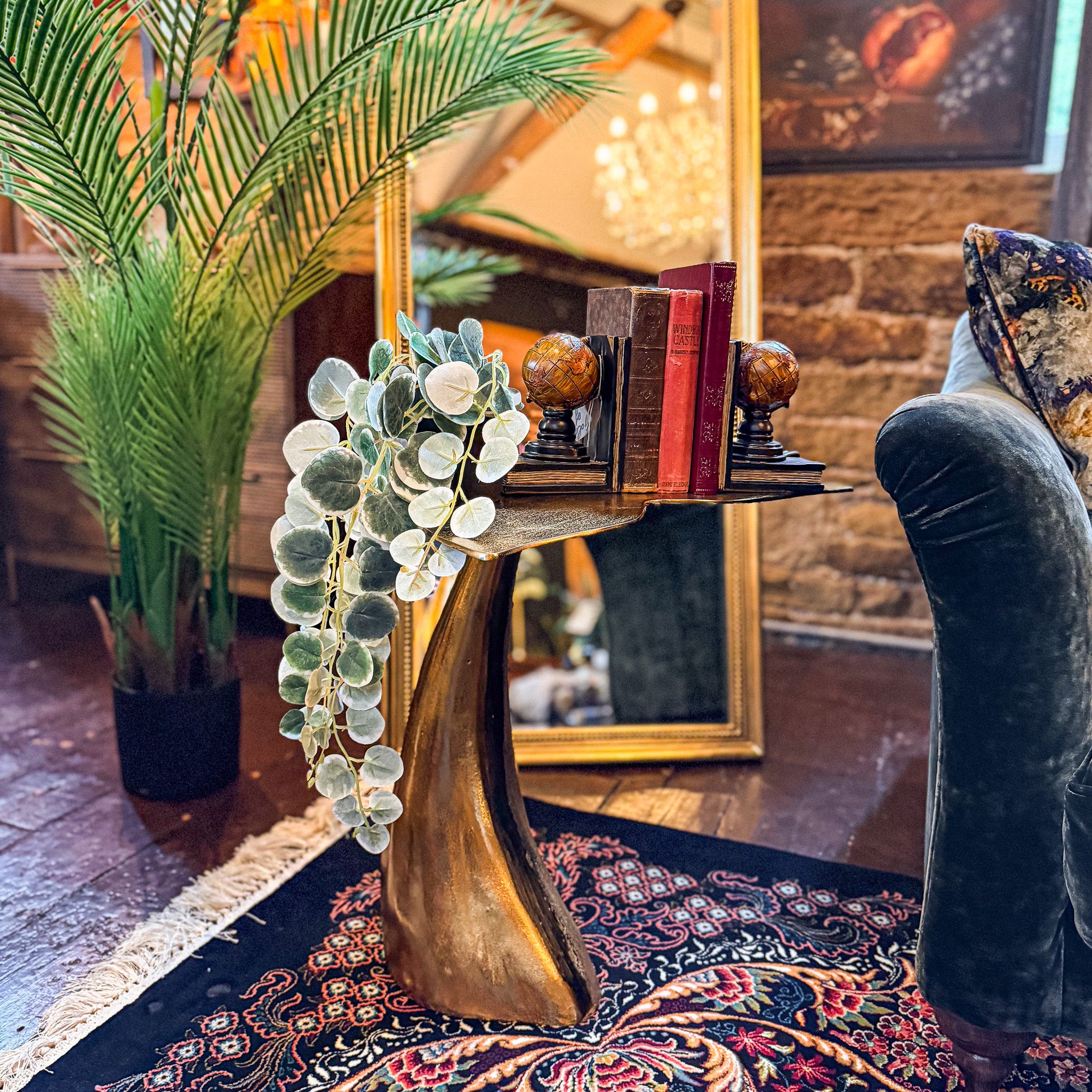Sculptural, sleek, and full of coastal charm, the Gold Aluminium Whale Tail Side Table is a statement piece that blends form and function. With a graceful, arched base inspired by the curve of a whale’s tail, this side table brings fluid movement and elegant drama to your room.