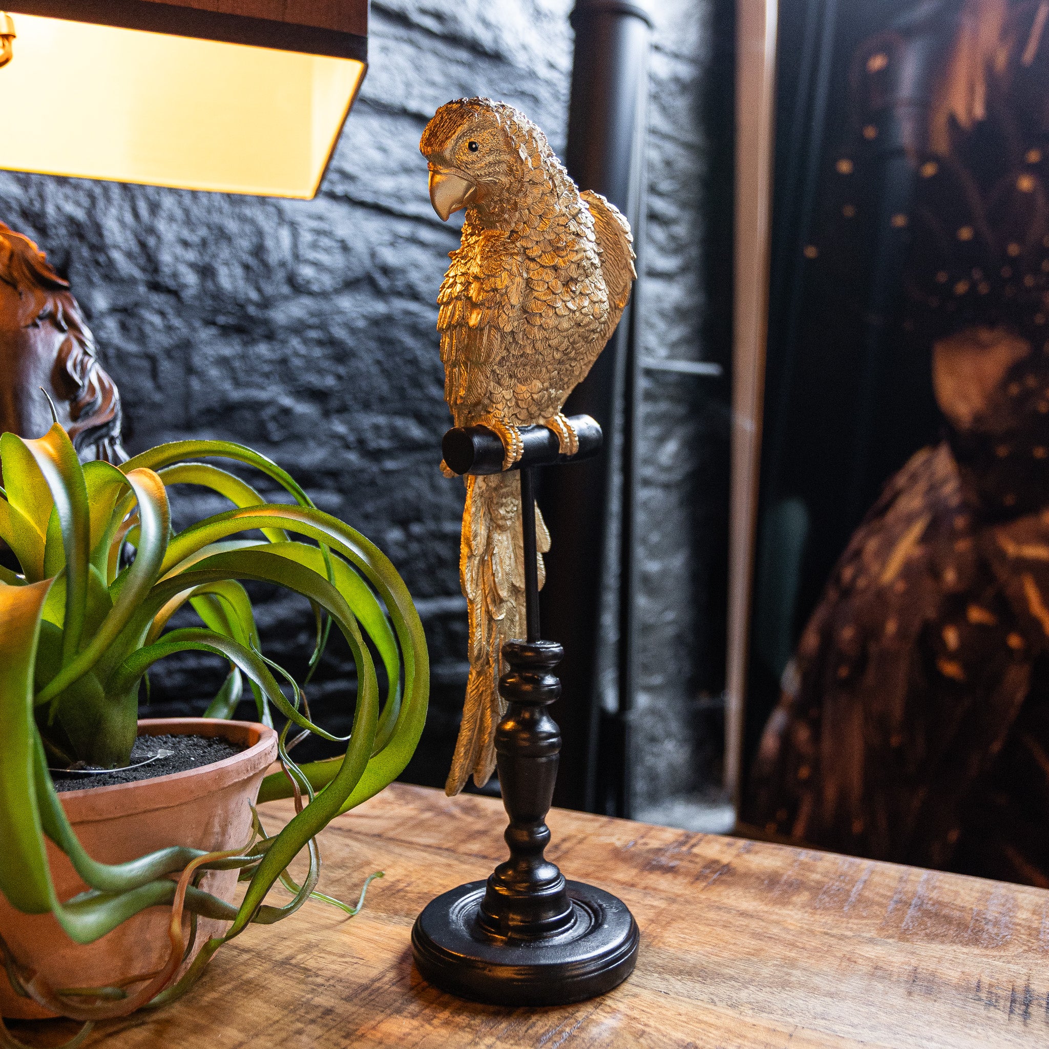 Ideal for a mantle, console, or bookshelf, this striking figure instantly transforms an ordinary corner into a styled vignette. Pair it with lush greenery for a tropical vibe, or let it shine solo as a bold decorative accent. Whimsical yet elegant, the Gold Parrot on Perch is a statement piece that brings a dash of playful sophistication to any room.