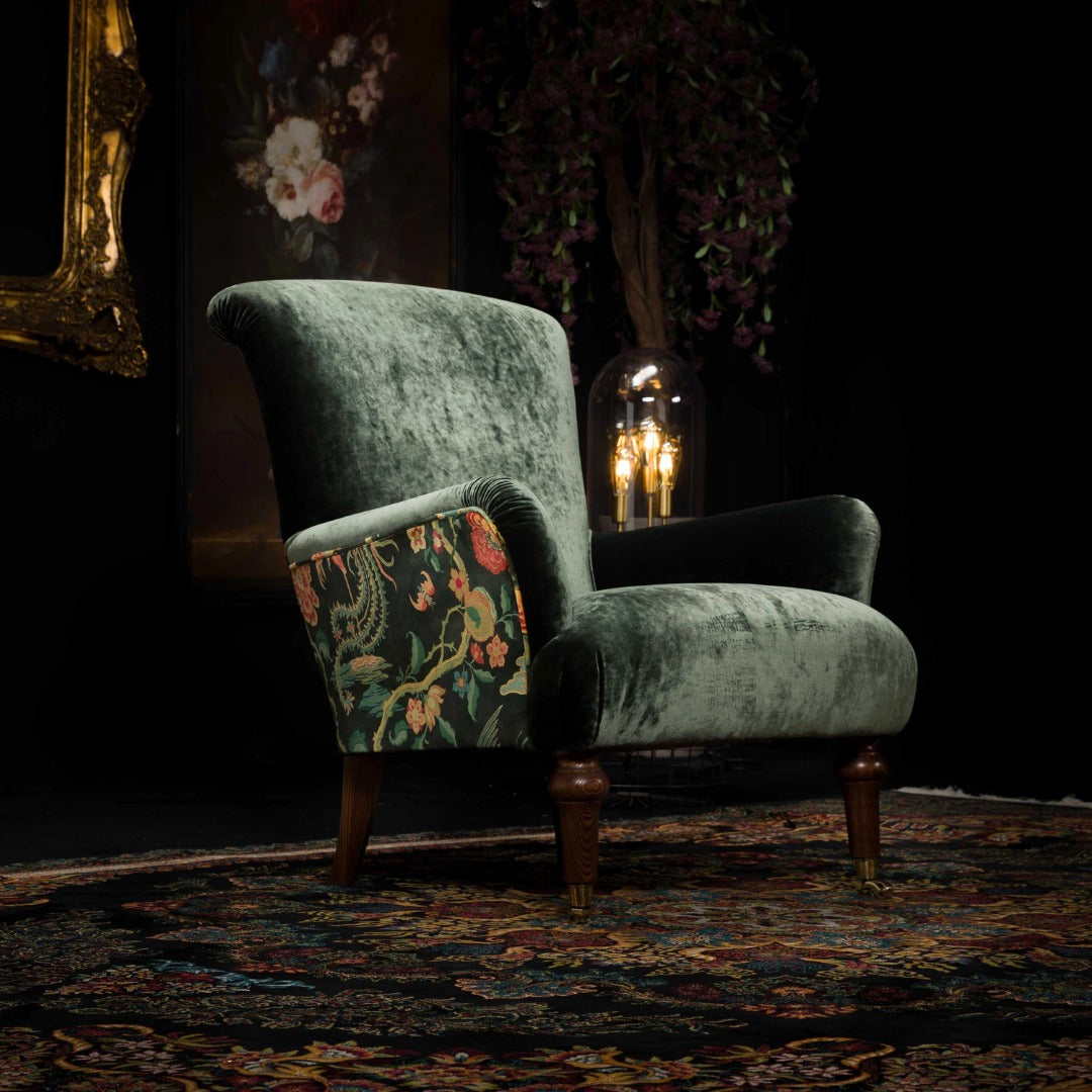 Meticulously made by hand in Preston, Lancashire, our Spink & Edgar Grace Armchair lives up to its name of effortless elegance and beauty. Based on classic art deco design, the Grace armchair is hand upholstered in contrasting floral GP & Baker sumptuous Italian velvet along the back and sides, making it stunning to admire from every angle.