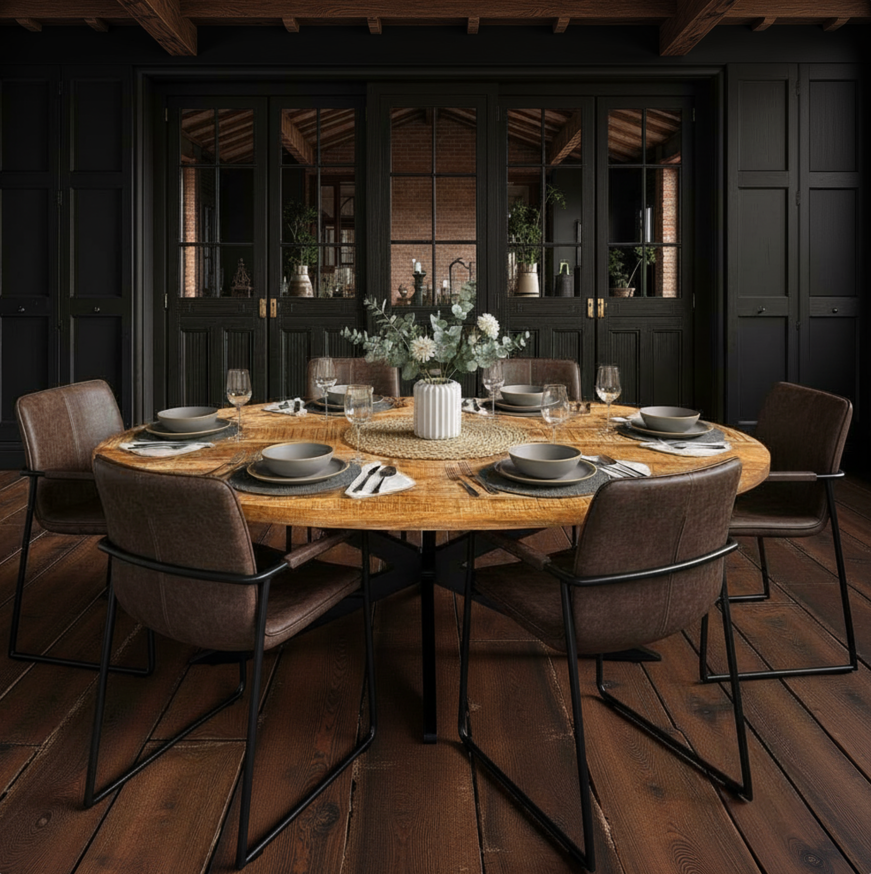 The Kerela Industrial Dining Table showcases the perfect balance of natural beauty and industrial edge. Crafted with a solid mango wood top, each piece features unique grain patterns and rich, warm tones that bring character and depth to your dining space. The sturdy metal frame provides a striking contrast, strong, industrial, and built to last, giving the table both visual impact and lasting durability. Designed in various sizes, it fits seamlessly into homes of all styles, from modern apartments to rustic lofts.