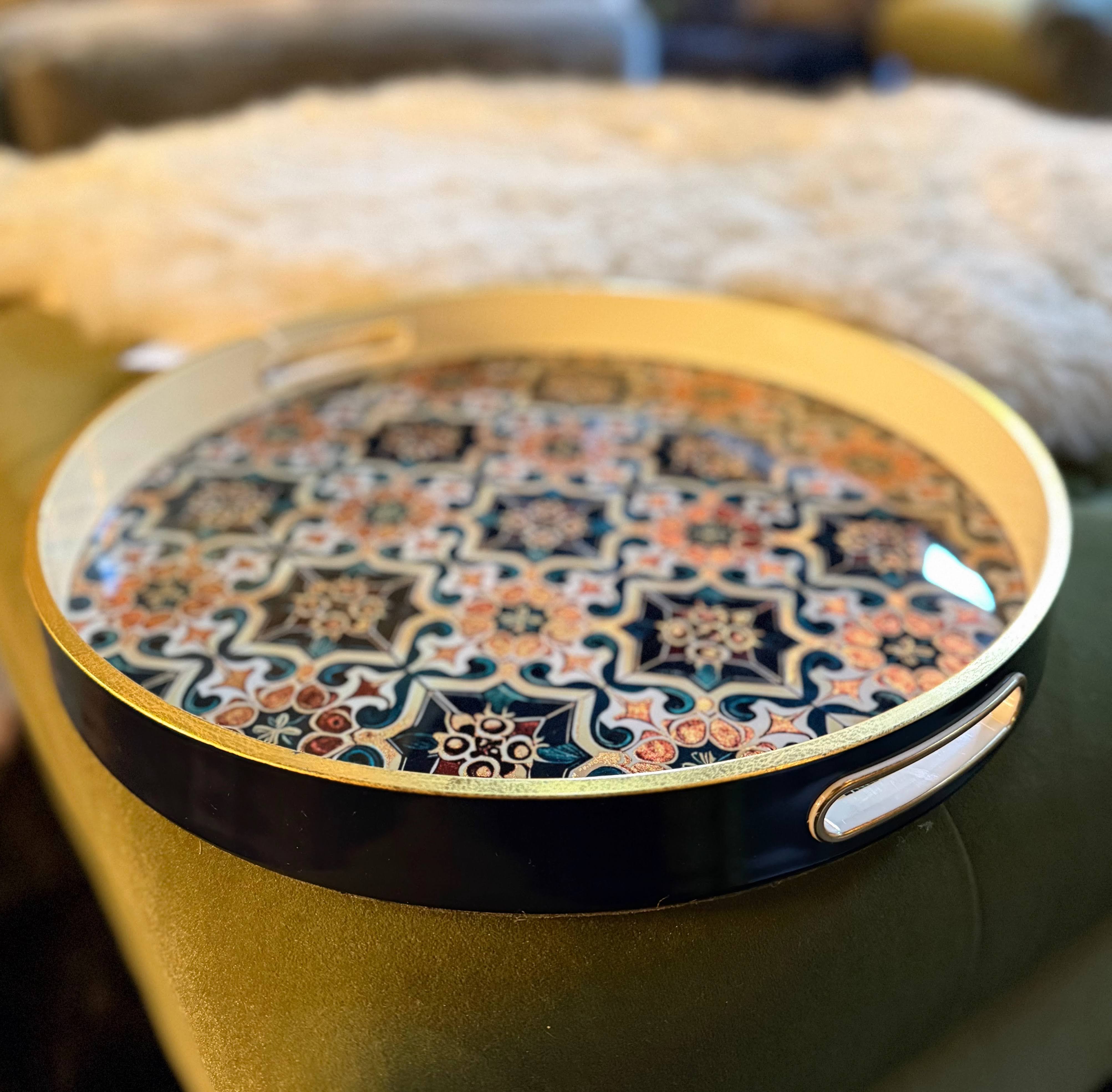 Measurements- 36cm D, 4cm H  Elevate your entertaining with this beautifully crafted Moroccan Drinks Tray, inspired by the ornate tile...