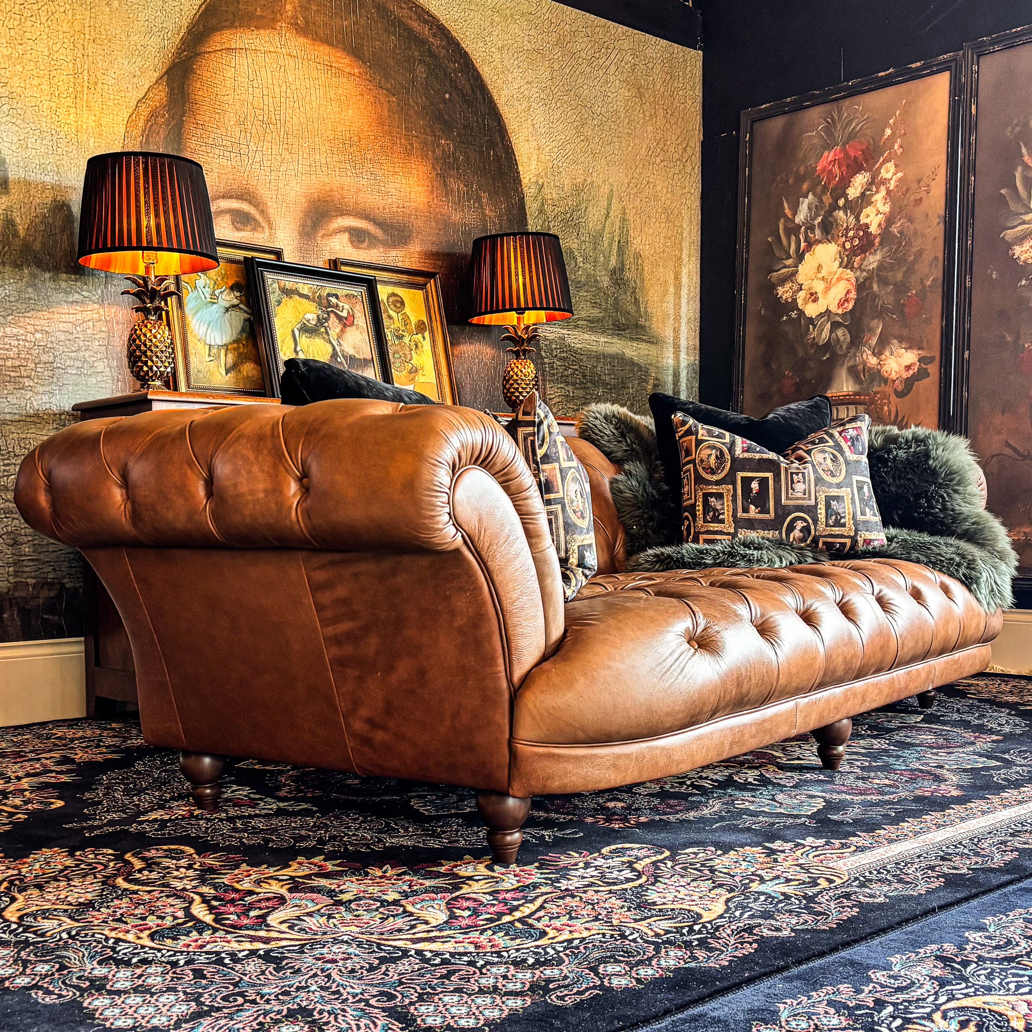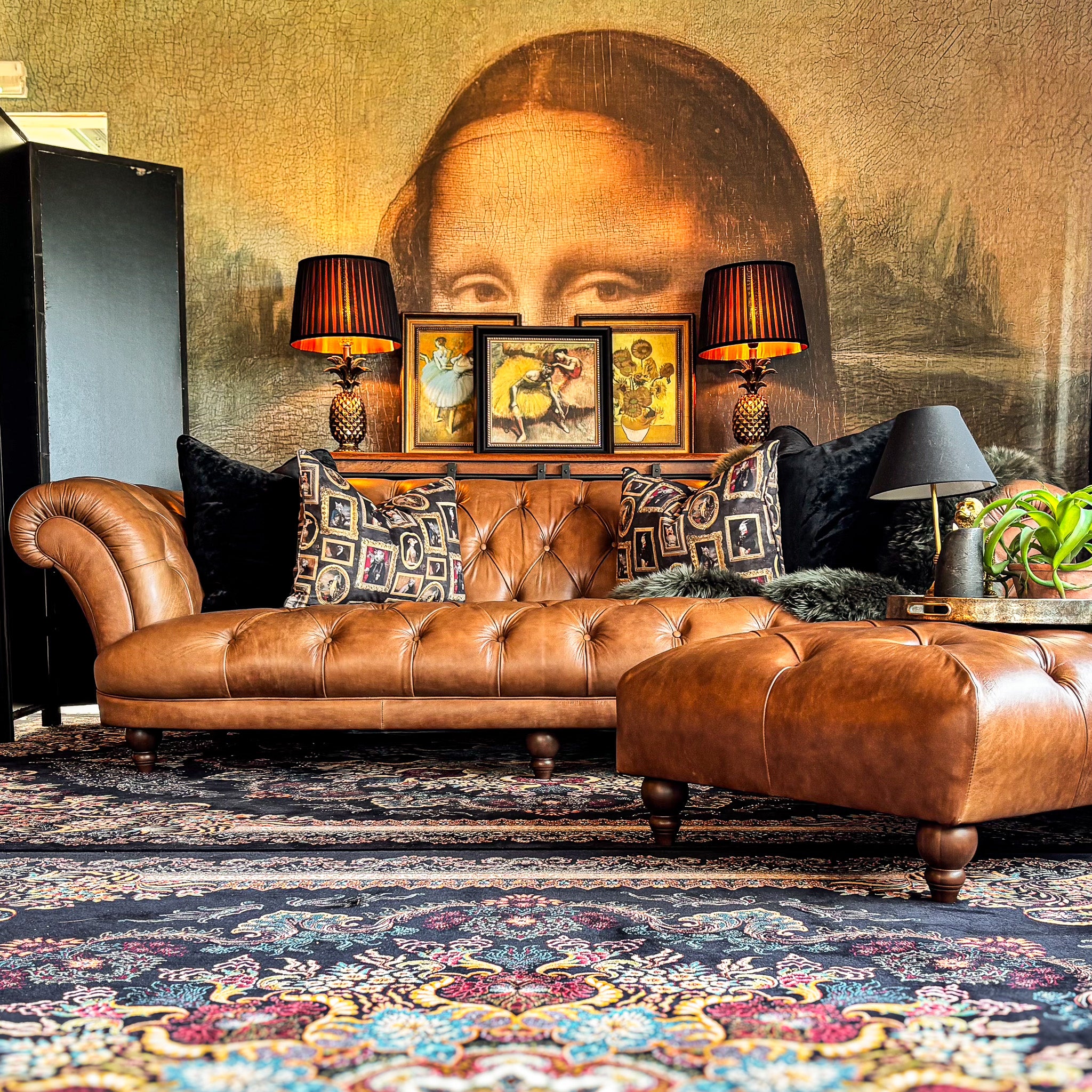 Every detail tells a story: the iconic deep button tufting, the gently rolled arms, and the low, sweeping back echo the grandeur of old-world design. Yet with its rich brandy leather finish, the Oskar Italia feels effortless, a sofa that belongs in both historic homes and contemporary lofts.