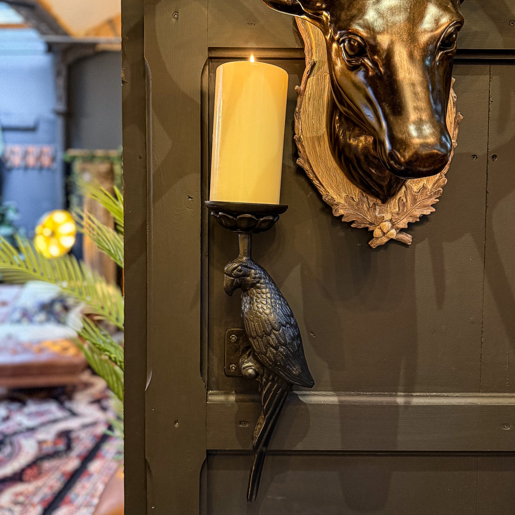Bring exotic elegance to your walls with our Pair of Large Black Parrot Wall Sconces, a striking duo that blends artistry and ambience. At approximately 46 cm high, these beautifully detailed parrots perch gracefully, rendered in matte black finish to add drama and sophistication. Each sconce features a socket for a candle or electric light, transforming your space into a tropical retreat with a moody twist. Whether flanking a fireplace, hallway, or mirror, these tropical silhouettes cast intriguing shadows and elevate any room into an adventurous, stylish haven.