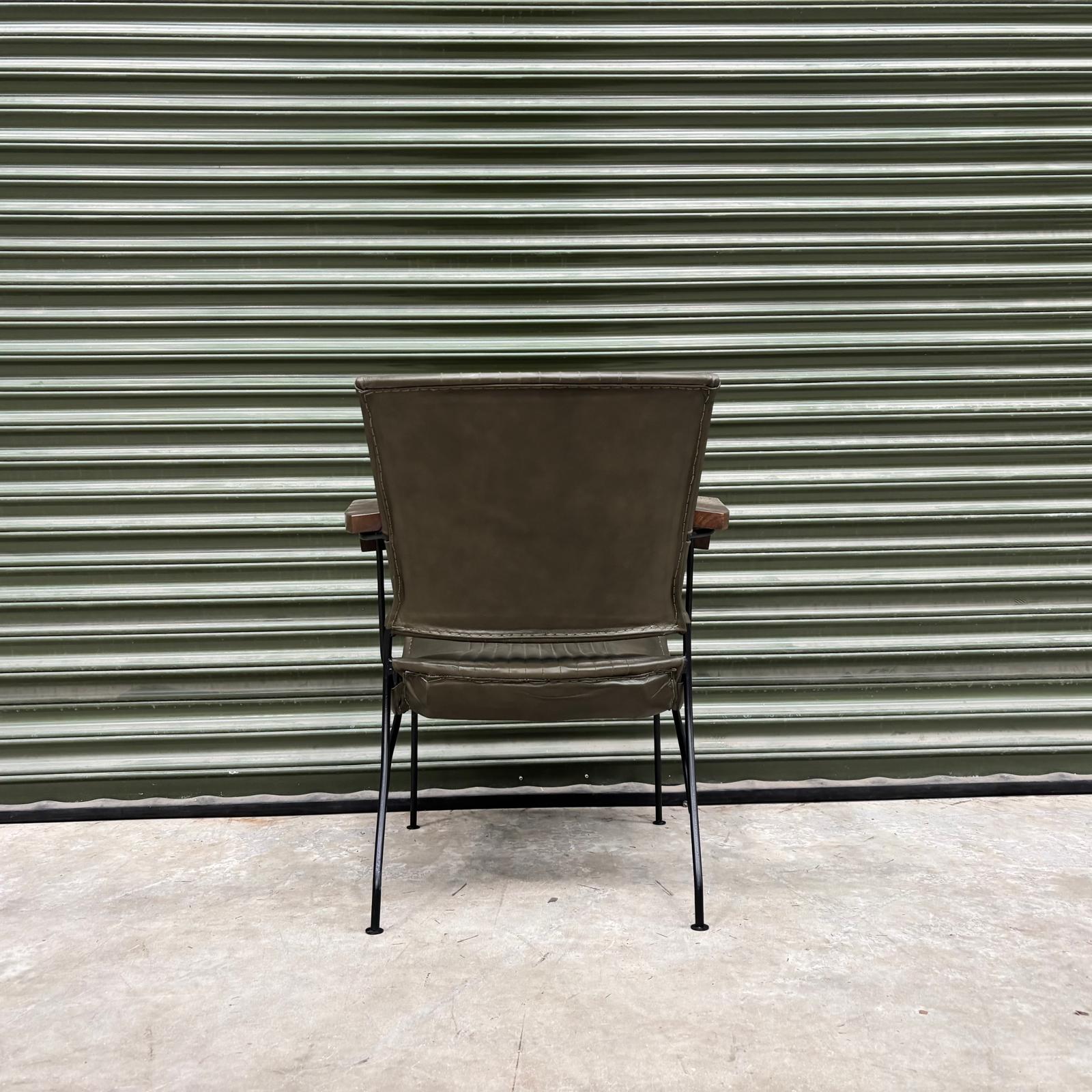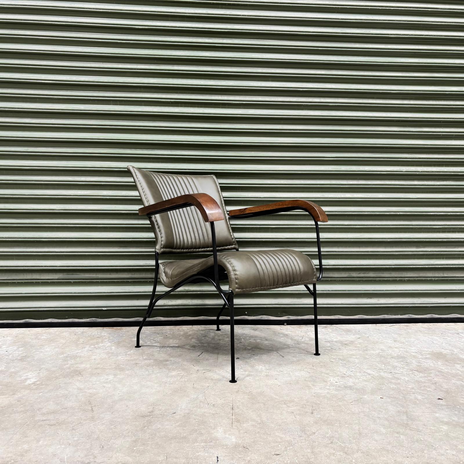 Bring a refined industrial feel into your space with this modern leather accent chair. Upholstered in smooth olive-toned leather with elegant vertical rib stitching, the seat offers a tailored look that feels both contemporary and timeless. The slim black metal frame keeps the silhouette light and architectural, while the gently curved wooden armrests add warmth and contrast.