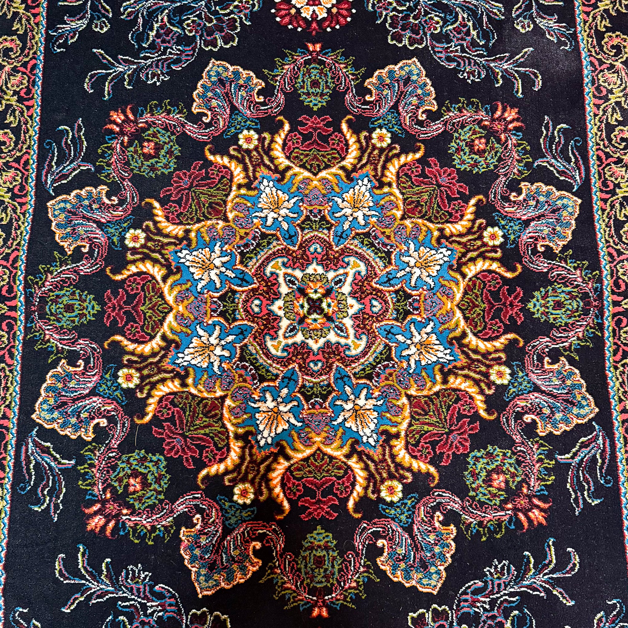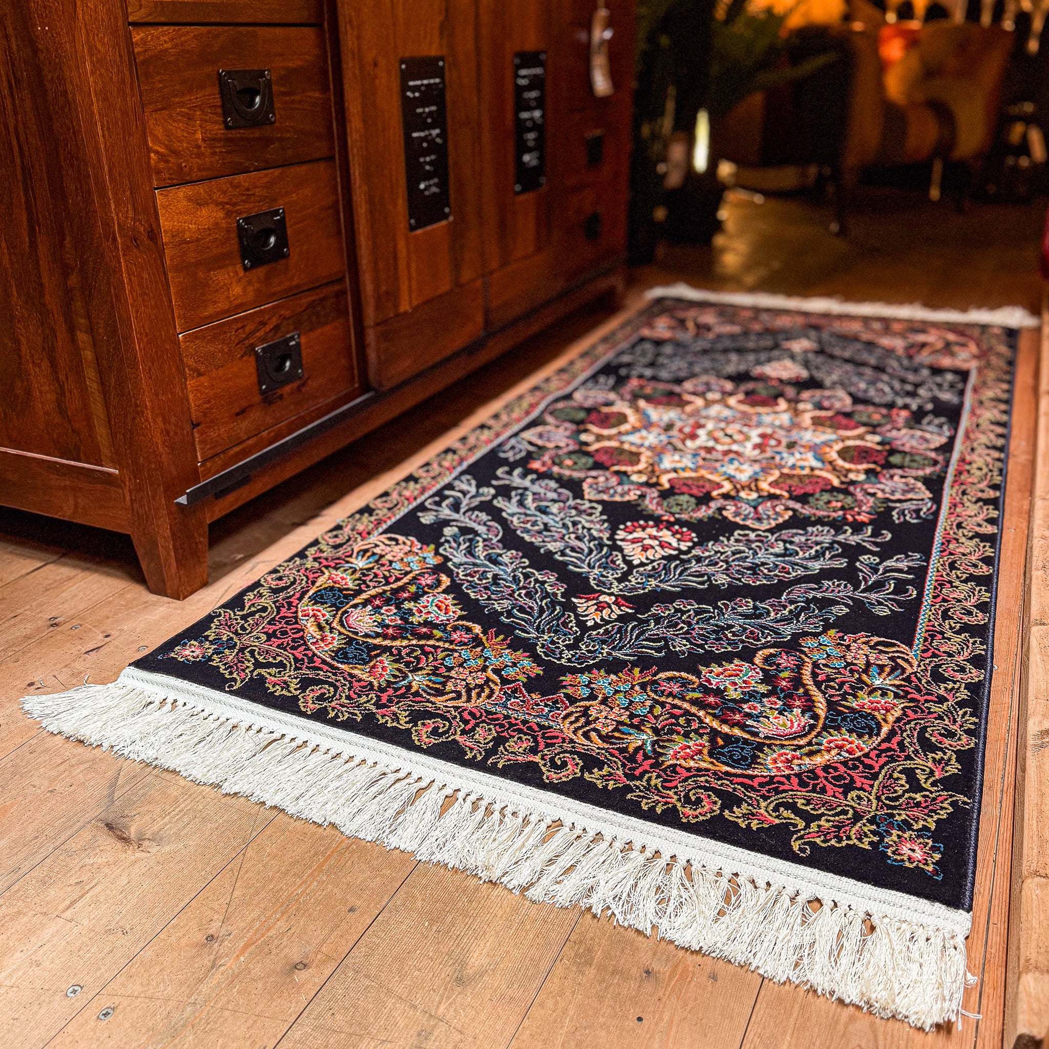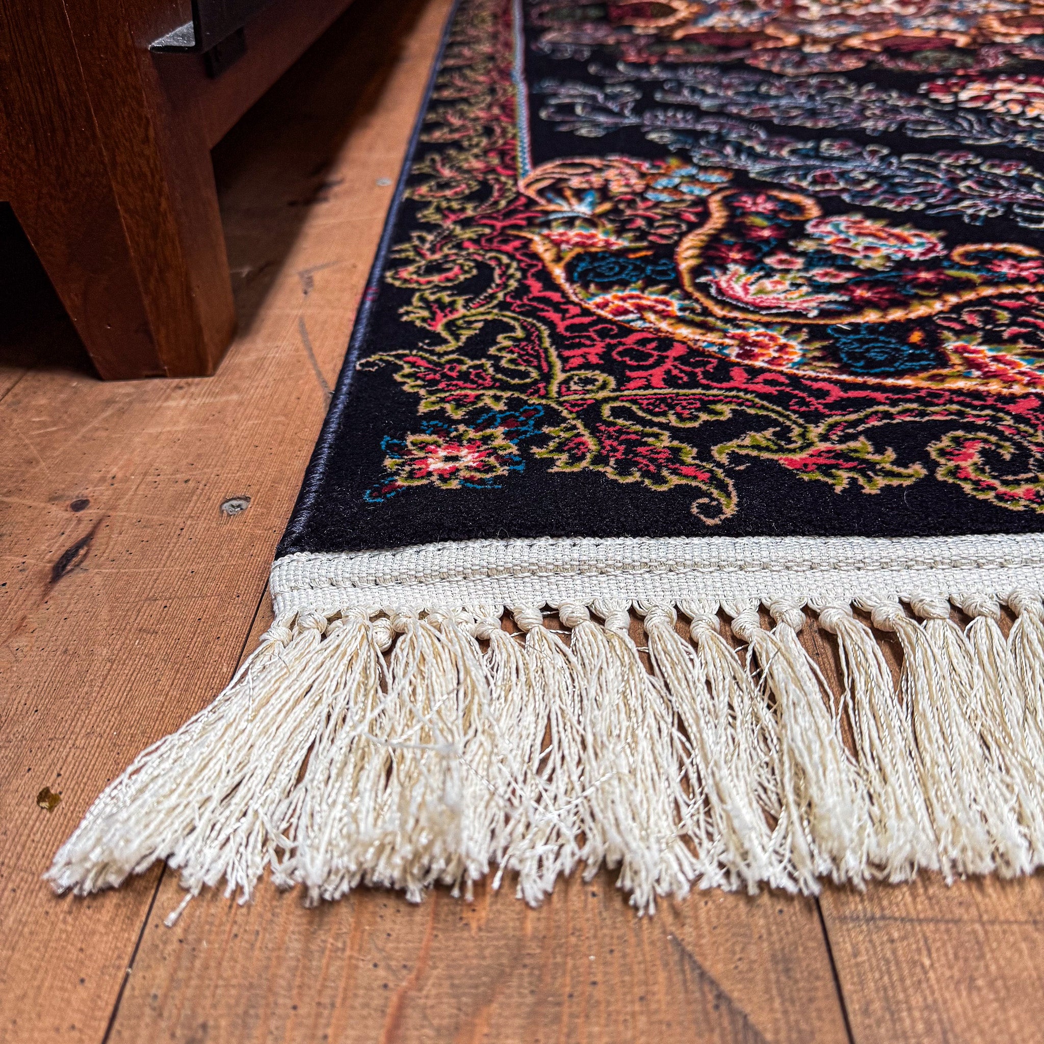 By the light of the moon the pixies danced; Our Moon flower rug is dramatic with inky blacks and  vibrant colours - all balanced to great effect. The decorative concentric pattern draws the eye across the ornate design to the central white star flower, making it a fabulous central focal point to a room.