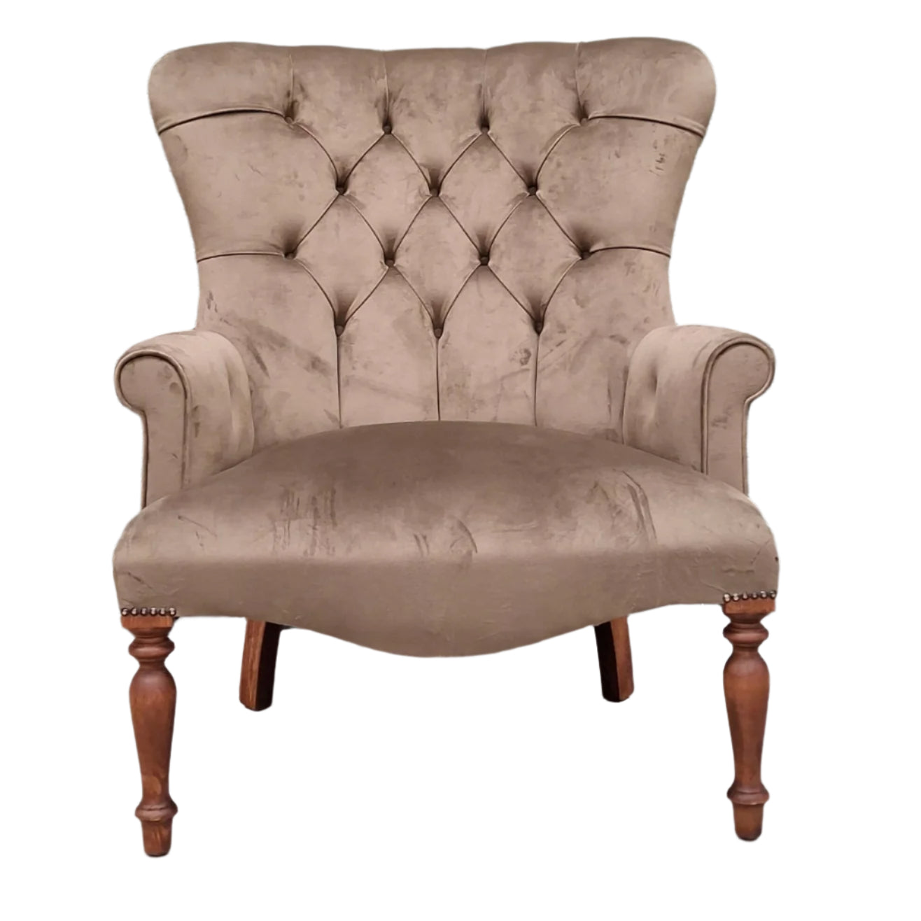 • Elegant Finishing Touches: Hand-polished turned legs and hand-tacked brass nails add a refined detail to the chair's design.