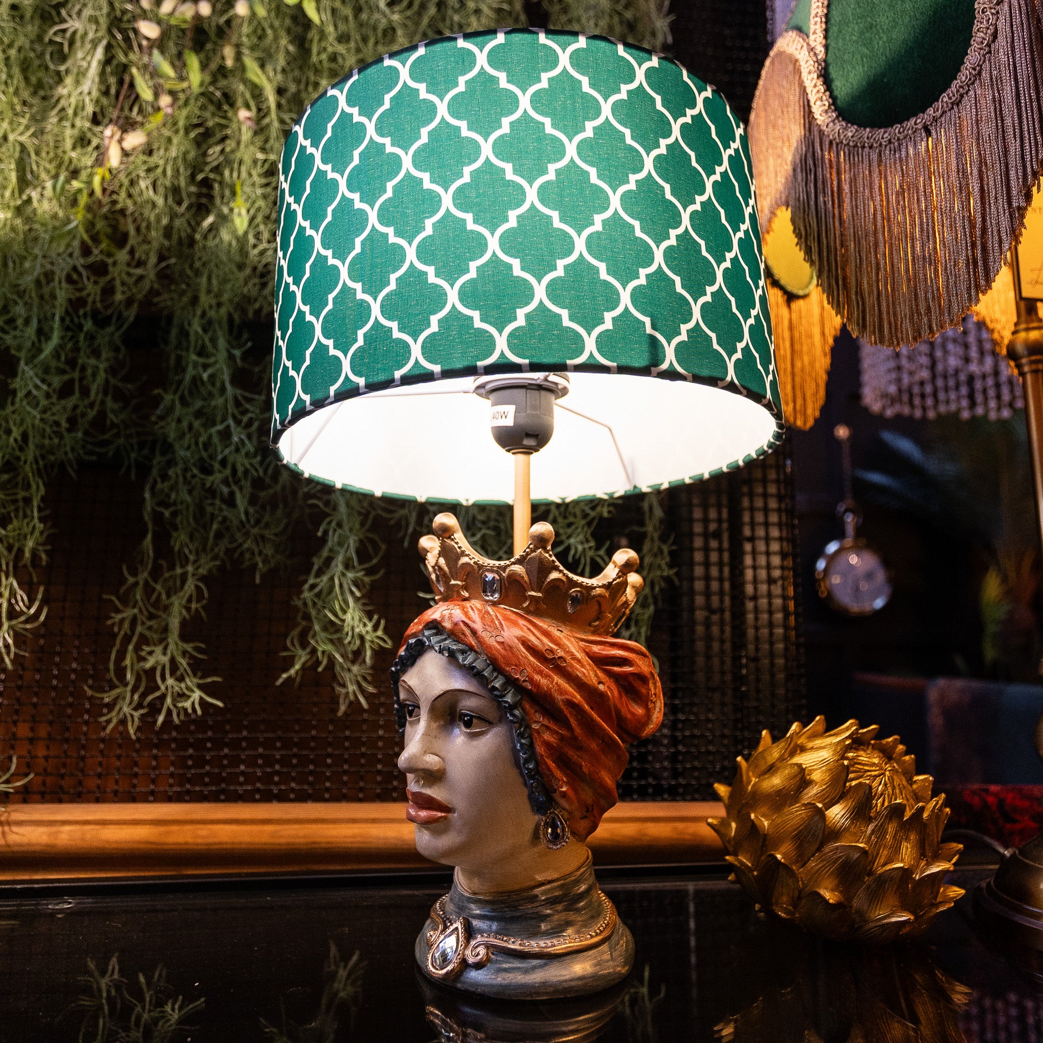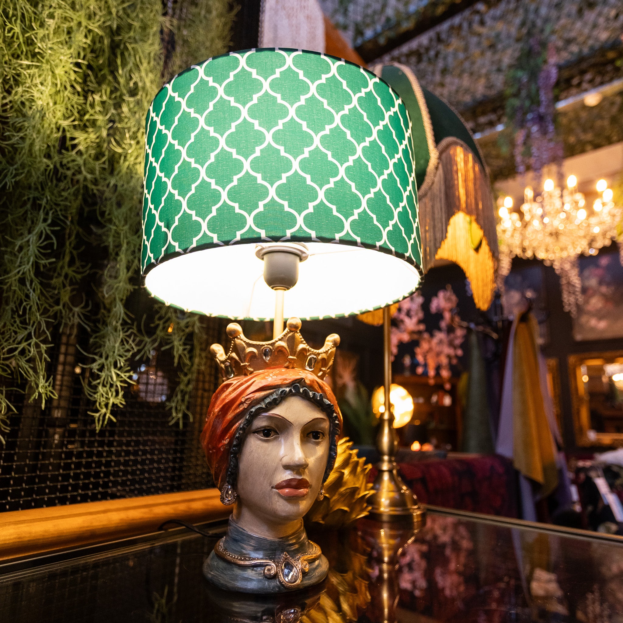 Give your space a regal and whimsical upgrade with the Sicilian Queen Head Table Lamp with Green Shade from Vintage Sofa. This striking lamp features a sculptural queen’s head base that captures the elegance of Mediterranean style. The rich green shade adds a warm, sophisticated glow, creating the perfect balance of artistry and function. Whether placed on a side table, bedside stand or hallway console, it’s a statement piece that brings timeless charm and character to any room.