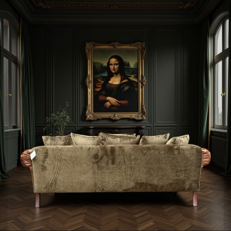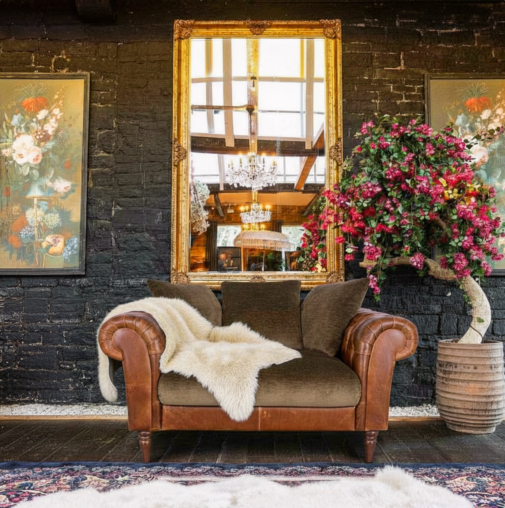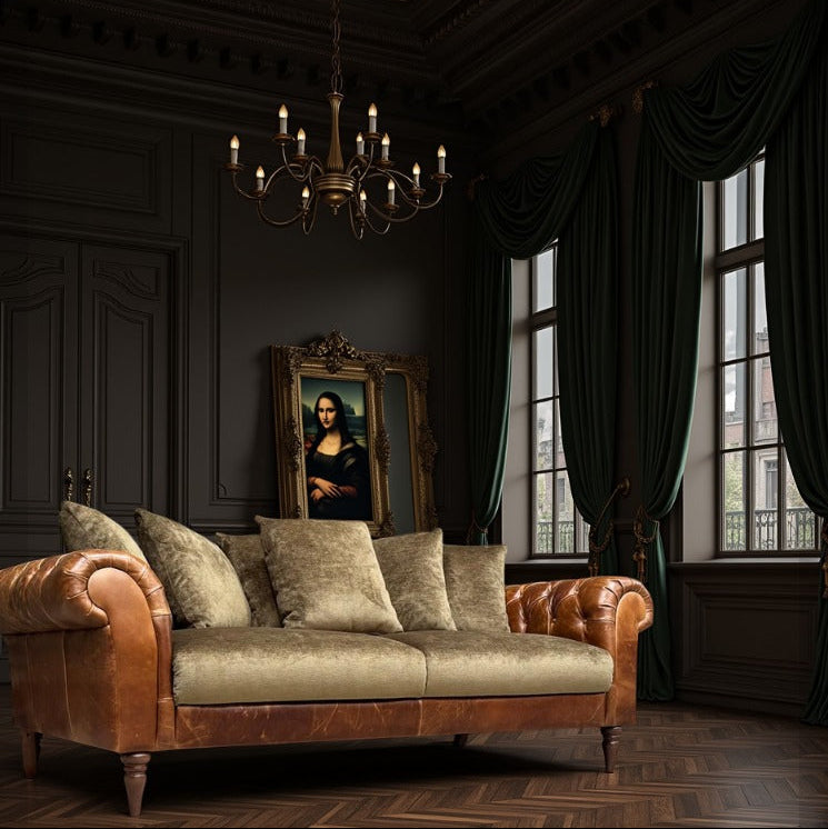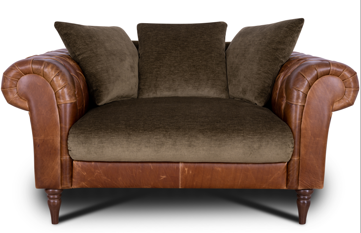 The Theodore combines rich velvet and natural leather, creating that perfect mix of texture and comfort. Each cushion is feather-filled, so it’s as soft and sink-in comfy as it looks.